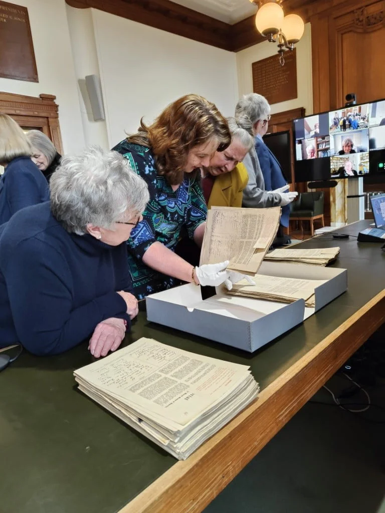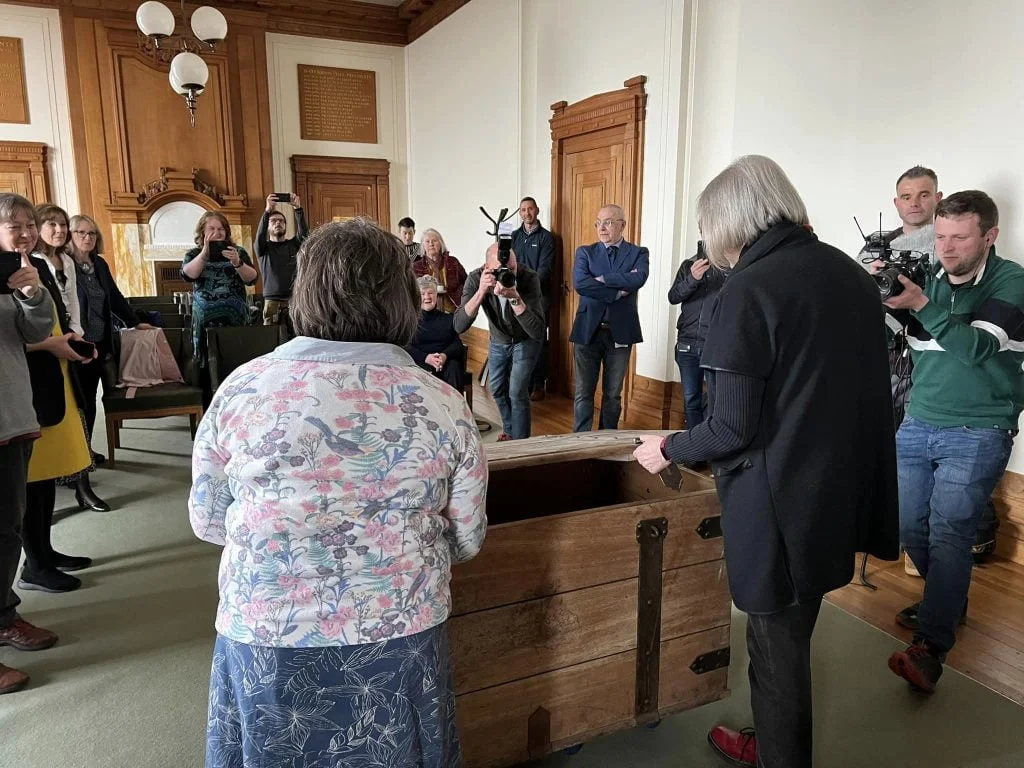 The chest and petition arrived at the National Library of Wales to a warm welcome by the people involved in the Women’s Peace Petition Partnership who have worked over many years to bring it back home. This return signals the first step in making it accessible to the people of Wales. Over the next year, the petition will now be catalogued, digitised, and opened to the public to crowdsource its transcription, along with several exhibitions at Amgueddfa Cymru – St Fagans, Wrecsam Museum, and the National Library of Wales in Aberystwyth.