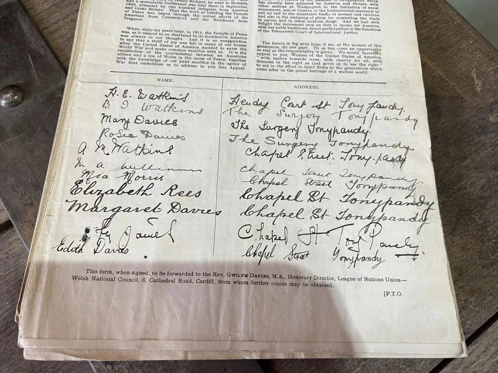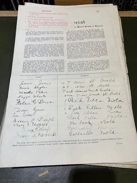 The Women of Wales for a World without War Partnership began working in 2019 with the National Library of Wales to borrow the chest and some of the petitions. The subsequent discussions with the National Museum of American History eventually resulted in this transfer to the National Library of Wales.