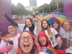 The final session was at the Iris mini film festival located in Cardiff Museum. The volunteers saw various LGBT+ films and also watched the film that they had created called ‘The Birthday Party’. The evening was fantastic and the films raised the issues transgender people face daily. Everyone enjoyed the mini film festival and were looking forward to the rest of the weekend volunteering at Pride Cymru.