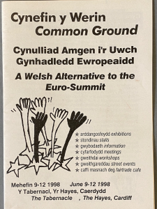 Cynefin y Werin1 came into being in the first half of 1998. A group of like-minded activists felt that it would be appropriate to organise an event for grass roots bodies and their members as an alternative to the European Council Summit meeting that was hosted by Cardiff on 15/16 June of that year, during the UK’s presidency of the Council.