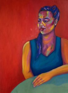 This portrait was created through a unique collaboration between the sitter and artist. Each woman had a say in how she was presented, what colours were used, what the message was within the art work.