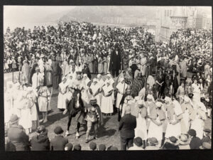 The Aberystwyth peace pageant itself was composed by the Welsh poet Cynan, in 3 parts: a historical narrative on causes of war and peacemakers past; a ‘ballet of war & peace’; and a procession of ‘the children of the world’. 800 children from 21 schools across Cardiganshire had learned about and dressed in homemade costumes representing nations of the world. The (14th) Youth Message of Peace & Goodwill was read out by each group of children, in the languages of nations they represented, before the whole audience closed with the Eisteddfod chant of ‘A Oes Heddwch!‘.
