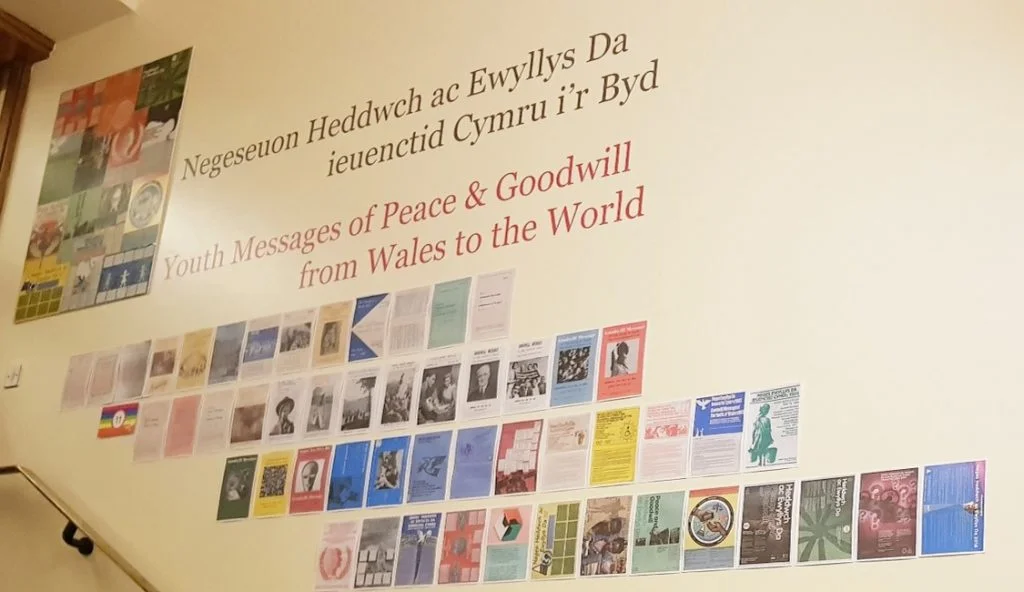Over the century, every generation of young people have been part of forming, sharing and responding to Wales’ Message of Peace and Goodwill; and this colourful montage displays the published covers of a century of peace messages, spotlighting the hopes and aspirations of successive generations of young people.