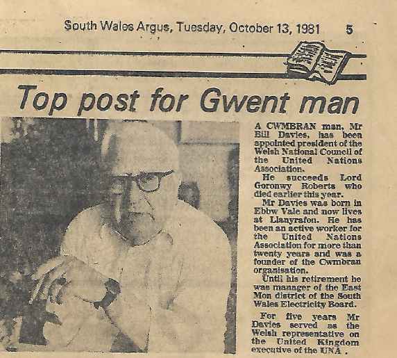 Much to dad’s surprise he actually won first prize of £500 . Dad decided he wanted to do something worthwhile with the money. At the time he was heavily involved with the Welsh Centre for International Affairs. (He had served as the Welsh representative on the UK executive of UNA for 5 years. In 1981 he was appointed president of Welsh National Council of the United Nations Association).