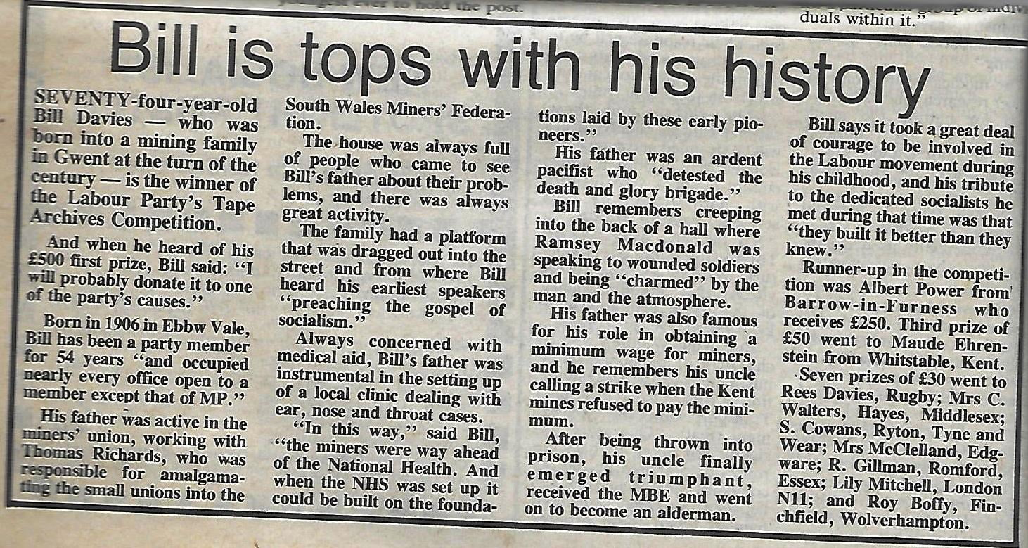 During James Callaghan’s premiership it was decided to hold a national competition among Labour party members to build up the information in the Labour Party archives. The competition was held in 1979. The secretary of each constituency was asked to seek out their longest serving members and ask them to make a tape recording for the Labour Party’s “Tape Archive Competition”. Dad was asked by the Secretary of the Monmouth Constituency Party Mr. Ray Hill to participate. Dad duly spoke into the tape about his early memories of the early Labour party days in Ebbw Vale, and the people who were welcomed into his home such as early Labour party greats including Noah Ablett, Enoch Morrell, Keir Hardie, his parents standing surety in case there was “crowd trouble “at the open air meetings. The ” soap box” people stood on to speak was kept under their stairs. As he said it took a great deal of courage to be involved in the Labour Movement during those early days.